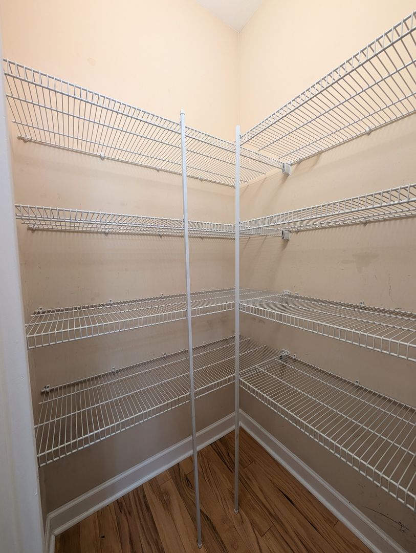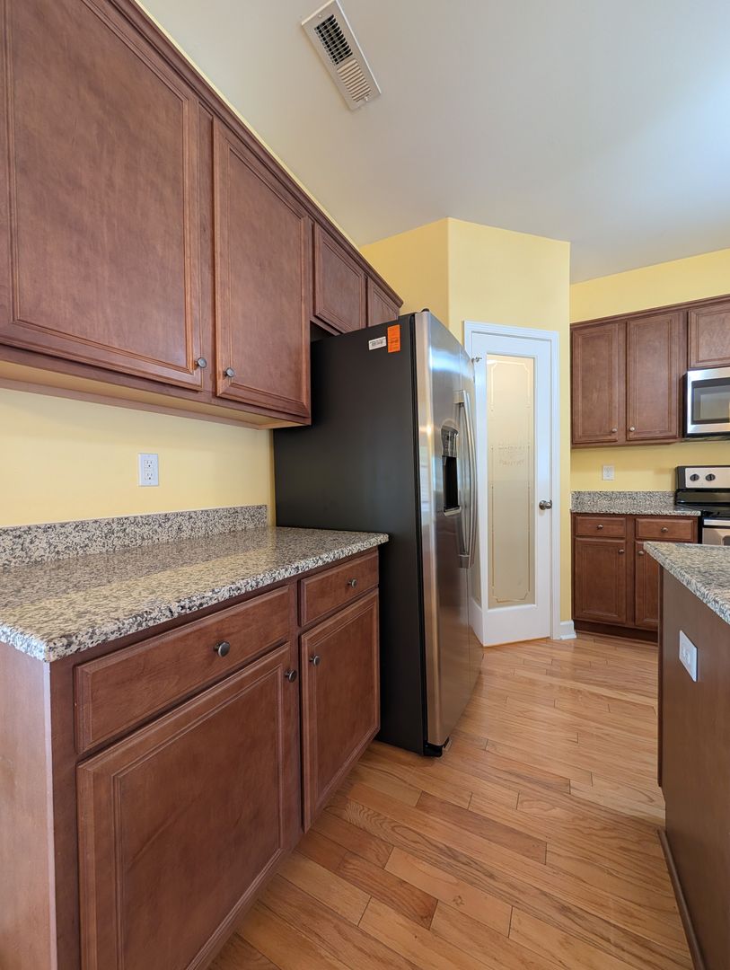 The kitchen features ample cabinet space, solid surface countertops, and stainless steel appliances, opening to the main living area. Hardwood flooring in the main living spaces adds warmth and durability.
