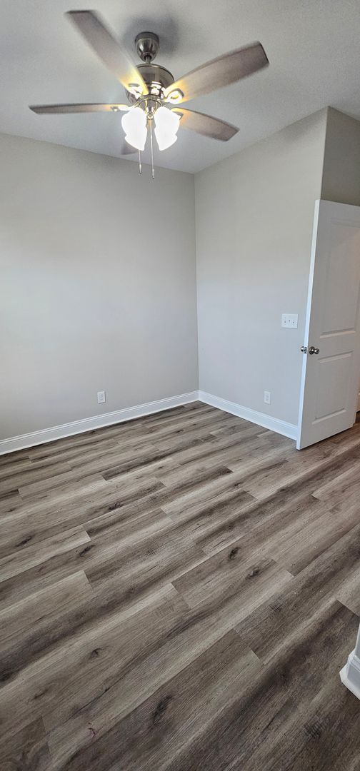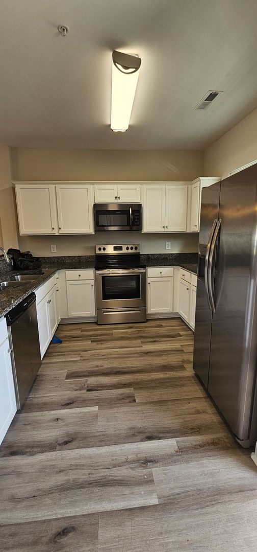 The kitchen is outfitted with sleek granite countertops and stainless steel appliances—perfect for everyday cooking or entertaining. Each bedroom includes a ceiling fan for added comfort.