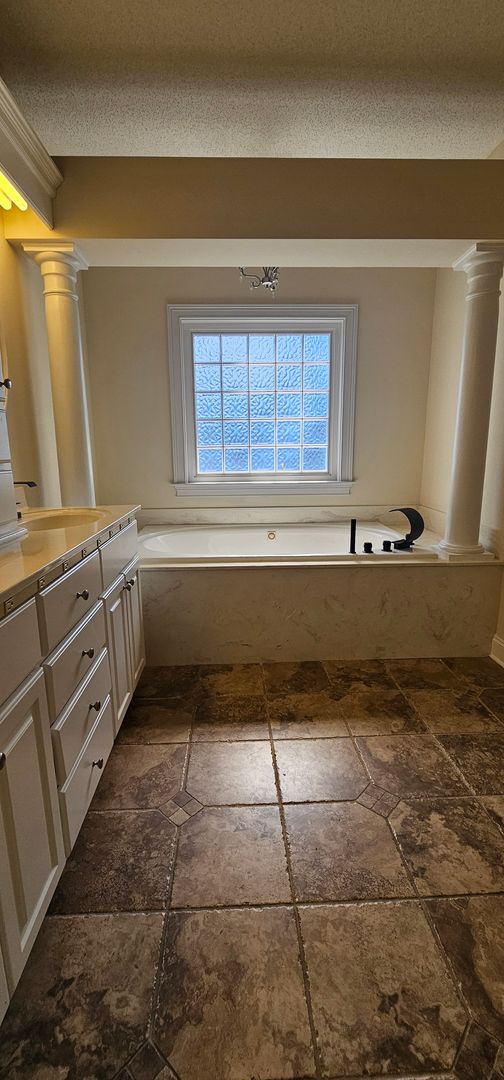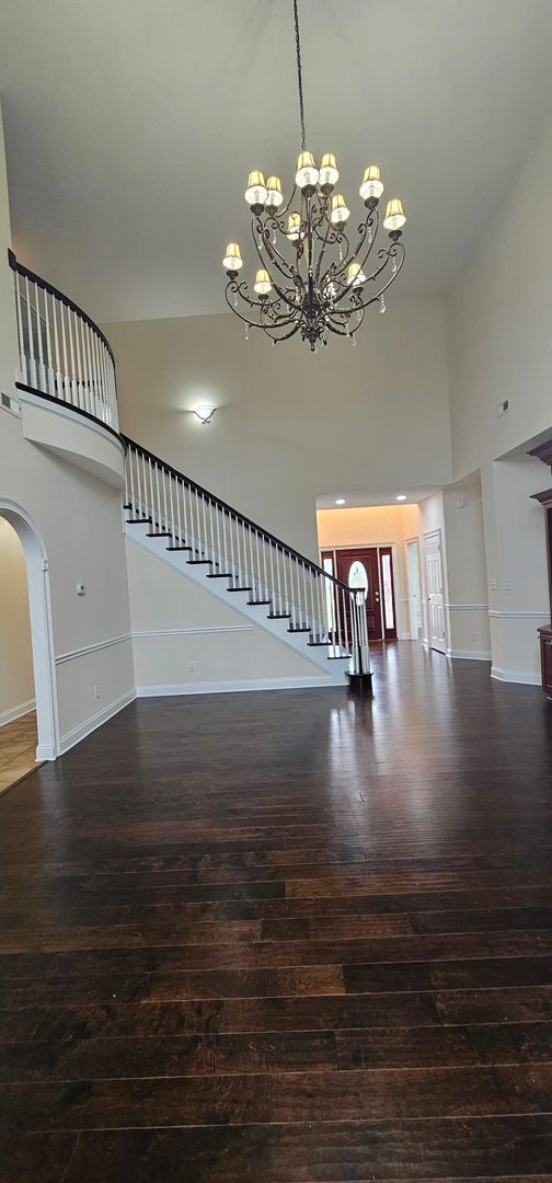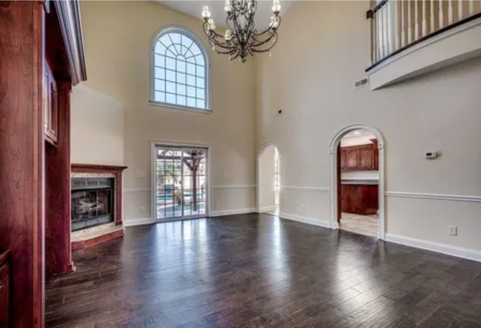 The family room features a stunning fireplace centerpiece surrounded by custom trim and opens seamlessly to the gourmet kitchen, complete with stainless steel appliances, a work island, and plenty of storage. A beautiful, sweeping staircase leads to the second floor — a showstopping architectural detail that gives the home a truly grand feel.