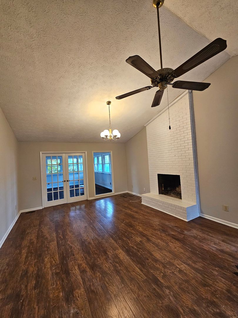 The foyer opens to a large kitchen with a window to the dining area, making meal preparation and entertaining effortless. The living room features vaulted ceilings, luxury vinyl plank flooring, and a decorative fireplace. French doors lead to a sun-filled Carolina Room, perfect for relaxing or hosting guests.