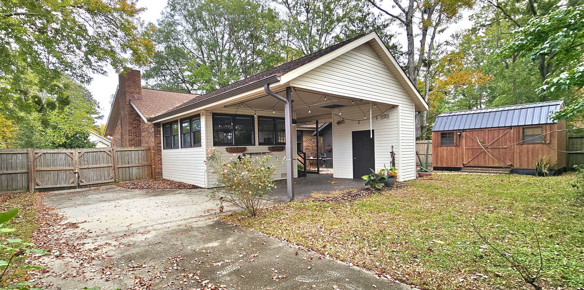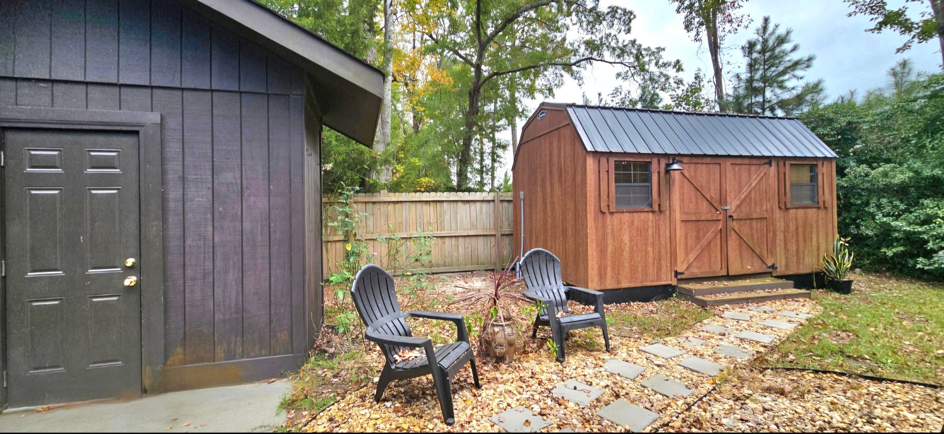 The fenced backyard is ideal for outdoor activities and gatherings and includes two storage sheds, one of which is insulated, AC-equipped, and hardwired for internet, offering extra functional space.